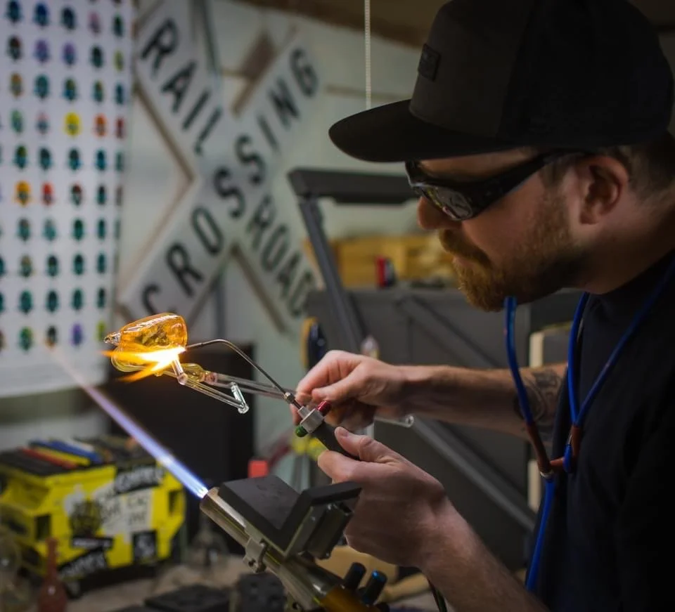 My interest in glass began in early 2016 while working at a dispensary in Colorado. I was selling glass pipes when my coworkers introduced me to the world of heady glass. Learning that these pieces were made entirely by hand—by a single artist—immediately captured my attention. Intrigued, I signed up for two beginner lampworking classes, and with just a few hours of experience, I began building my own studio.